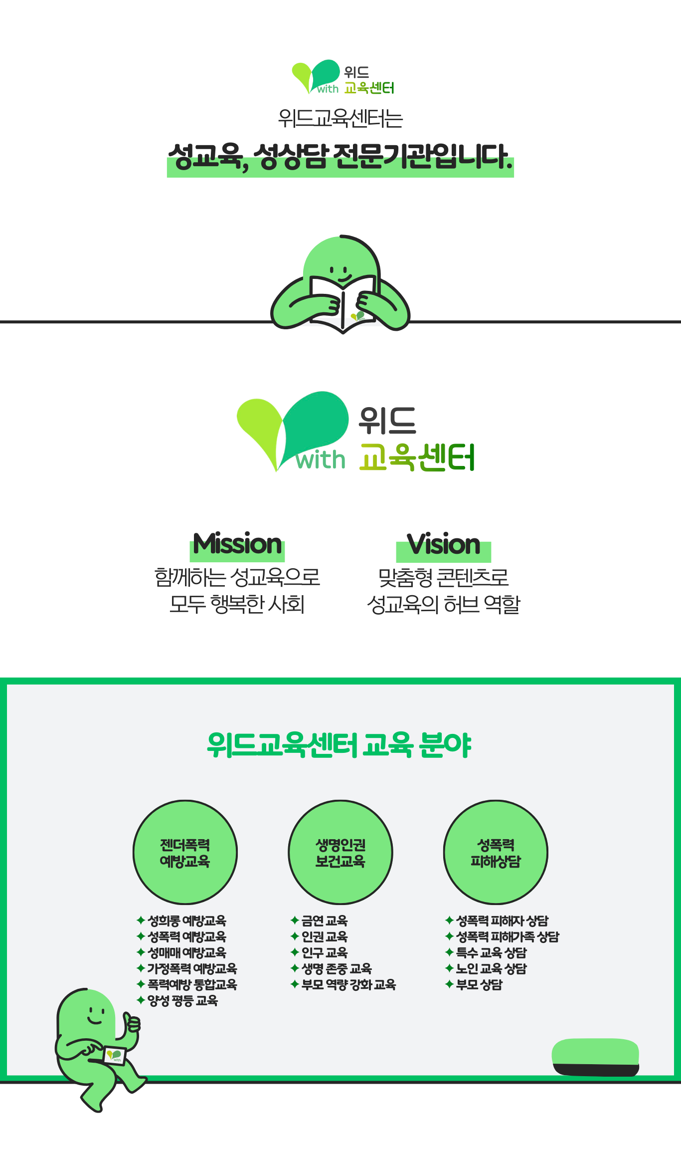 20여 년간 인구보건복지협회 부설 성폭력상담소에서 성교육 및 성상담 활동을 이어온 전문 강사진이, 2017년부터 보다 폭넓은 교육 활동을 위해 위드교육센터로 새롭게 출발하게 되었습니다. 오랜 현장 경험과 전문성을 바탕으로 보다 체계적이고 신뢰할 수 있는 교육 서비스를 제공하고 있습니다.